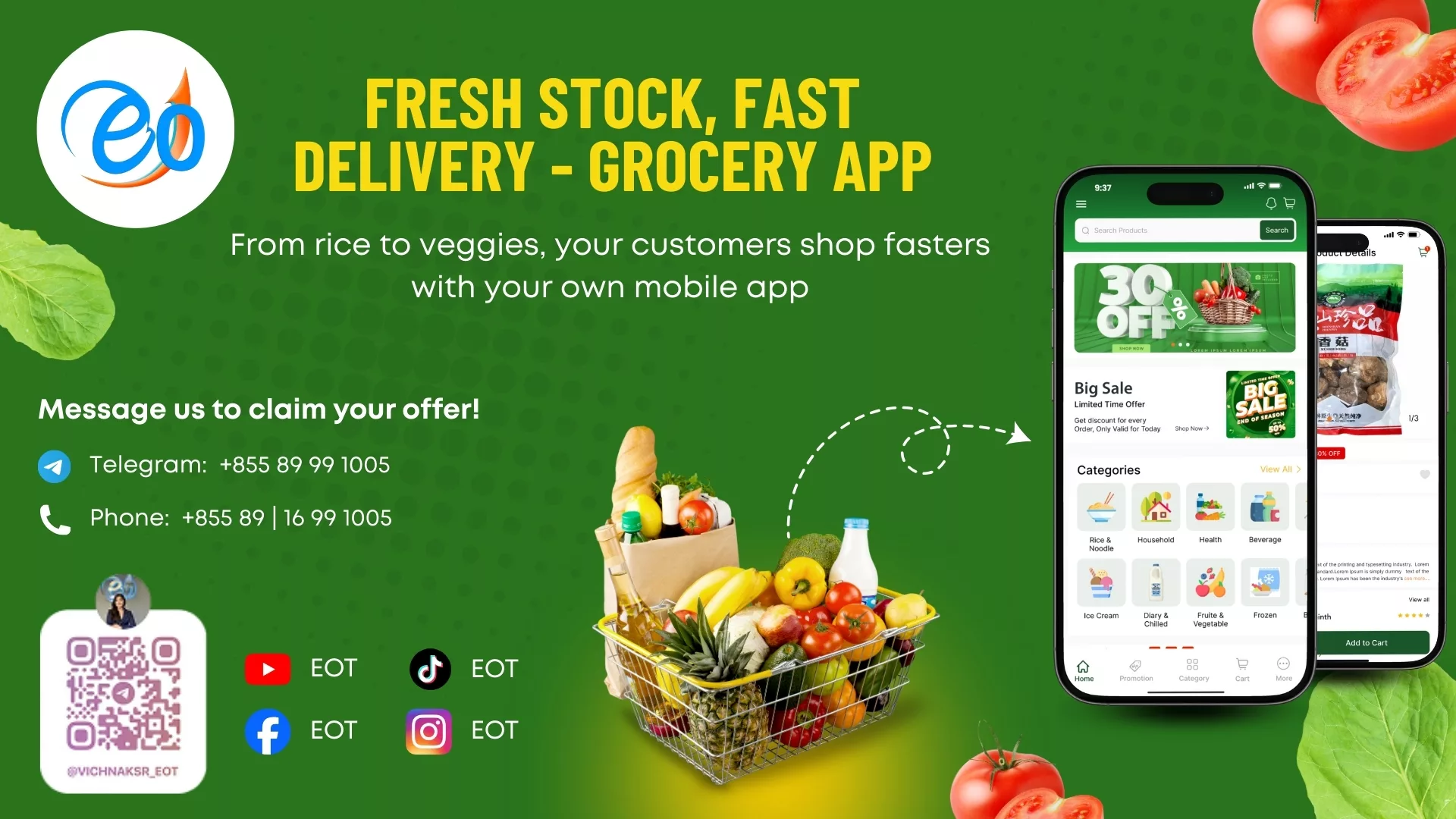EOT’s Grocery Store App is a pre-built, customizable app designed to bring your grocery store online quickly and efficiently. Our ready-made solution allows you to easily rebrand the app with your store’s identity, providing a fast and cost-effective way to go digital. Whether you own a local market or a chain of grocery stores, this app offers a structured solution to help you engage more customers and grow your business.